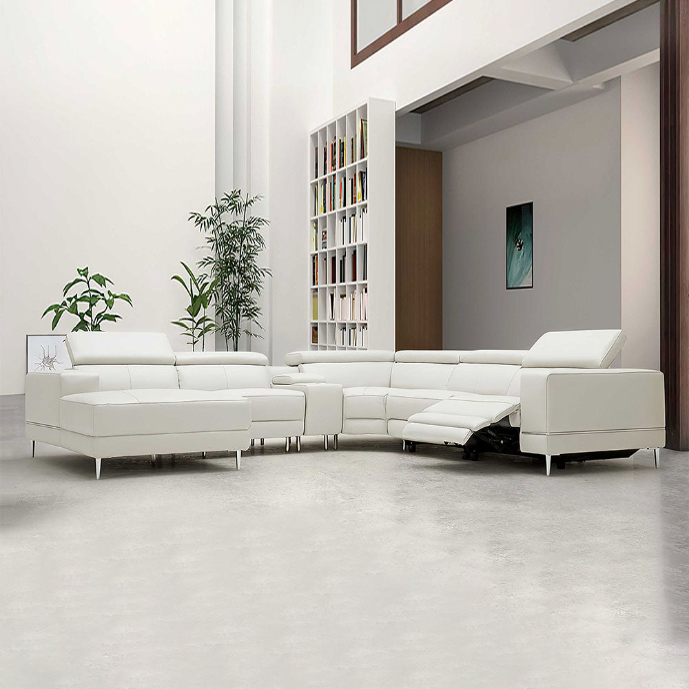 Made to be long-lasting and durable. This modern sectional features power recliners with adjustable headrests and a lift up storage space in the console table. It comes with 2 USB ports and 2 hidden outlets. This modular sectional with Chaise lounge chair comes with stainless steel legs to provide comfort and stability. A perfect piece for any contemporary home and the ideal sectional when it comes to spending time with friends and family.